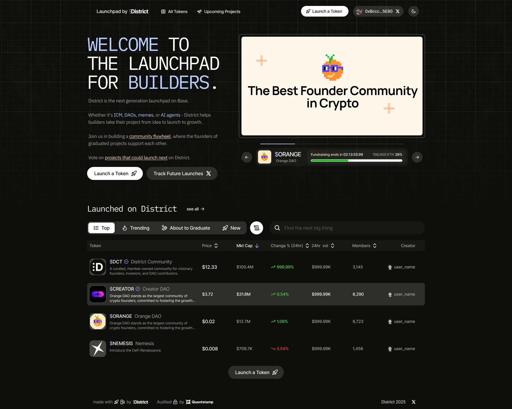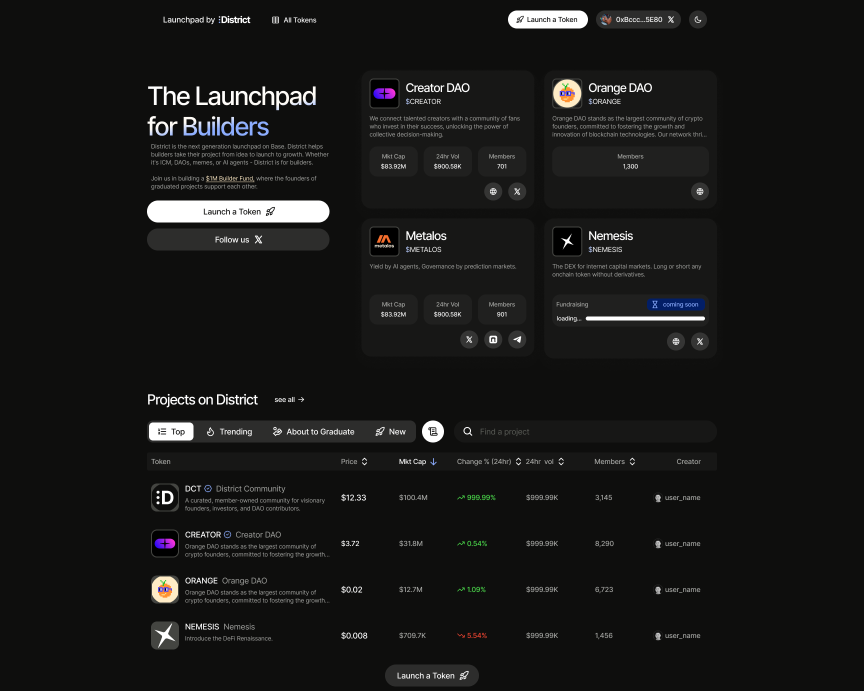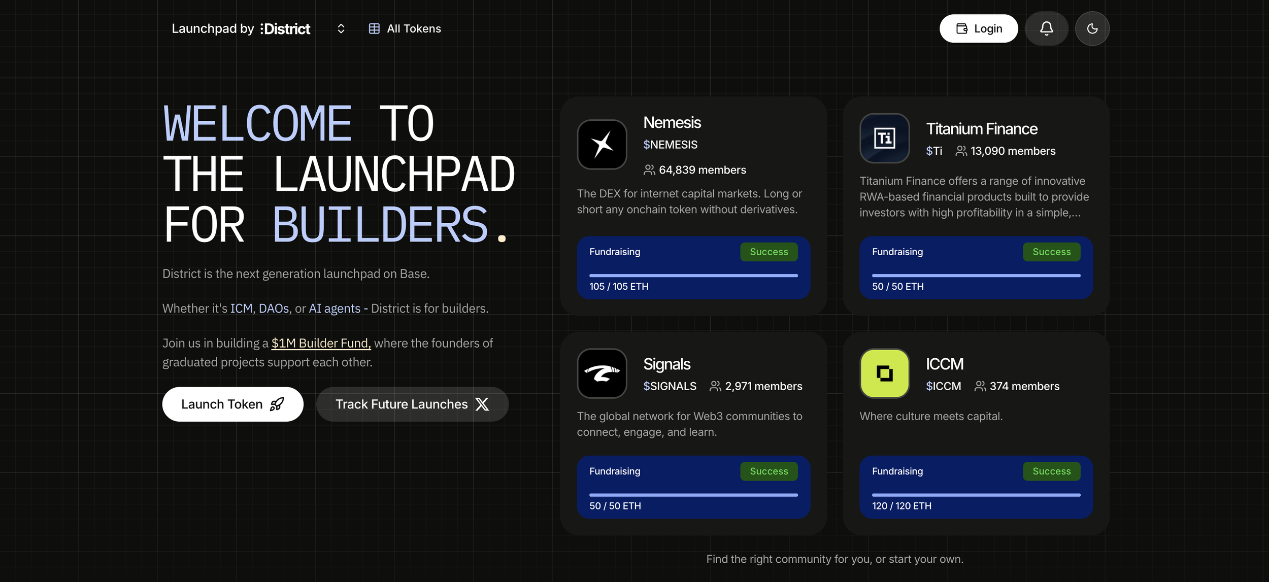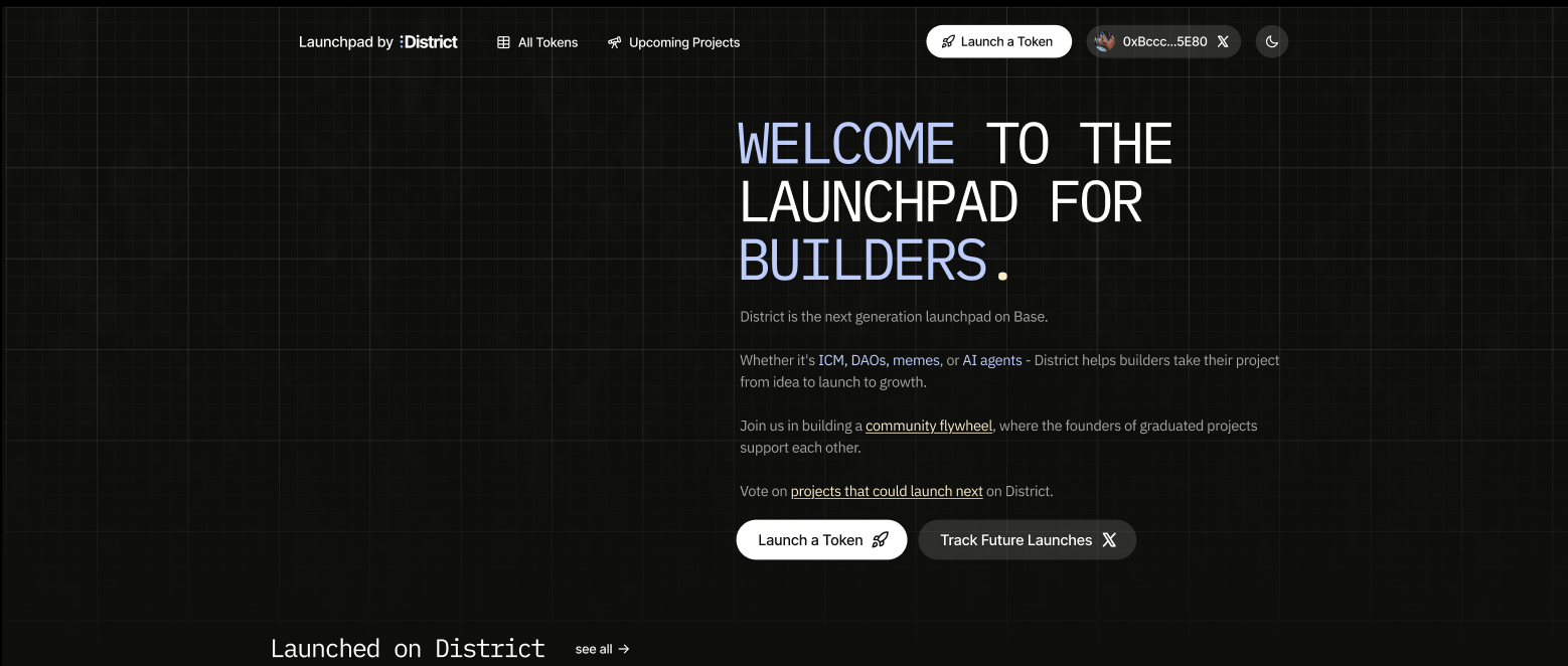 District is a Base-native Web3 launchpad designed to help serious builders raise capital through token launches backed by a vetted founder and ecosystem support.